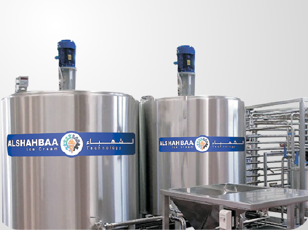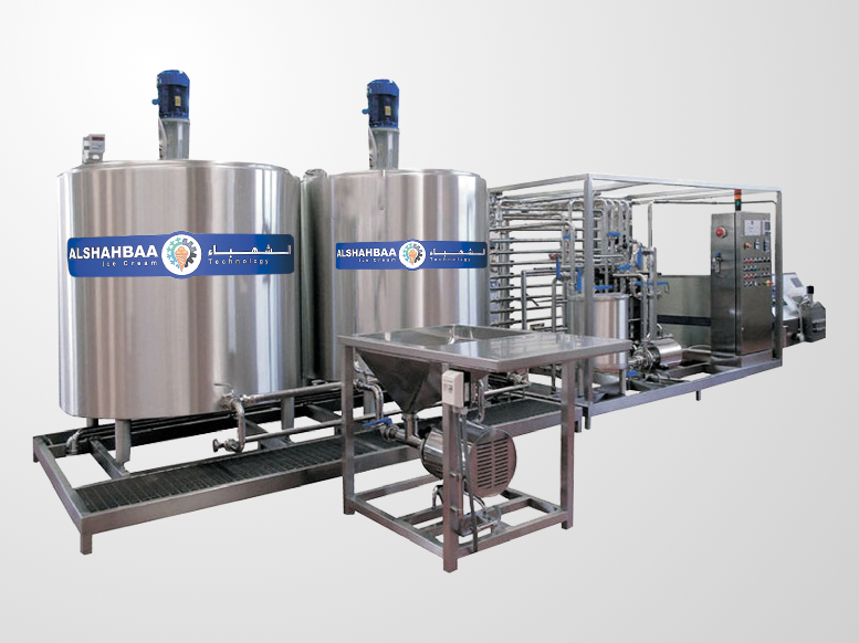 The continuous pasteurization line for ice cream mix (using hot water boiler) operates through homogenization, pre-cooling, and instant cooling down to 4°C.