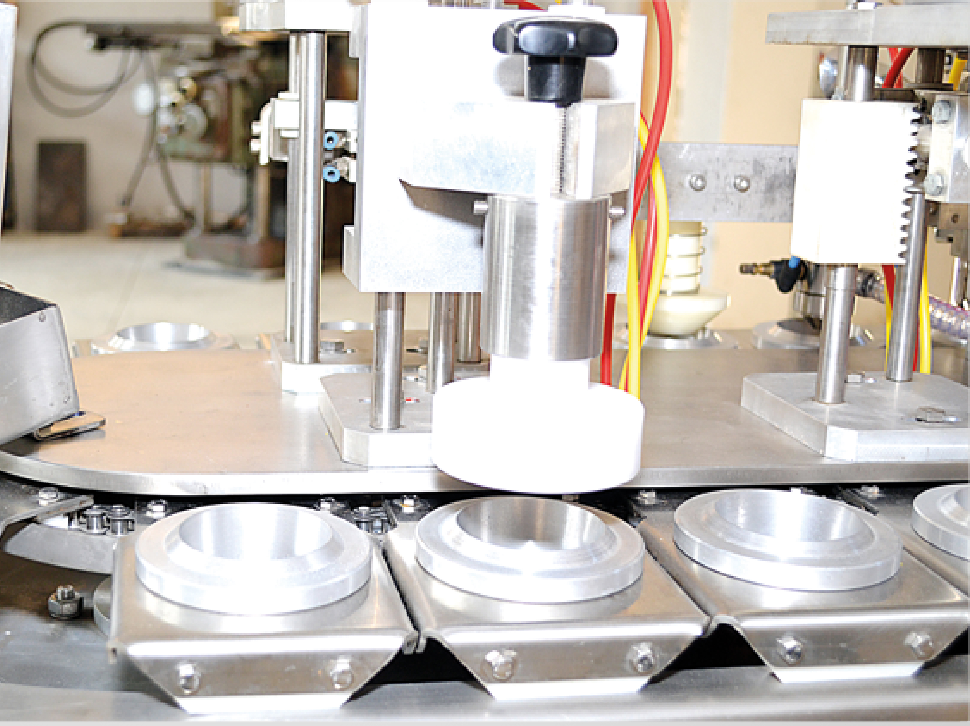 The machine features a temperature-controlled filling head, vertically adjustable during operation to ensure complete and accurate filling of each container.