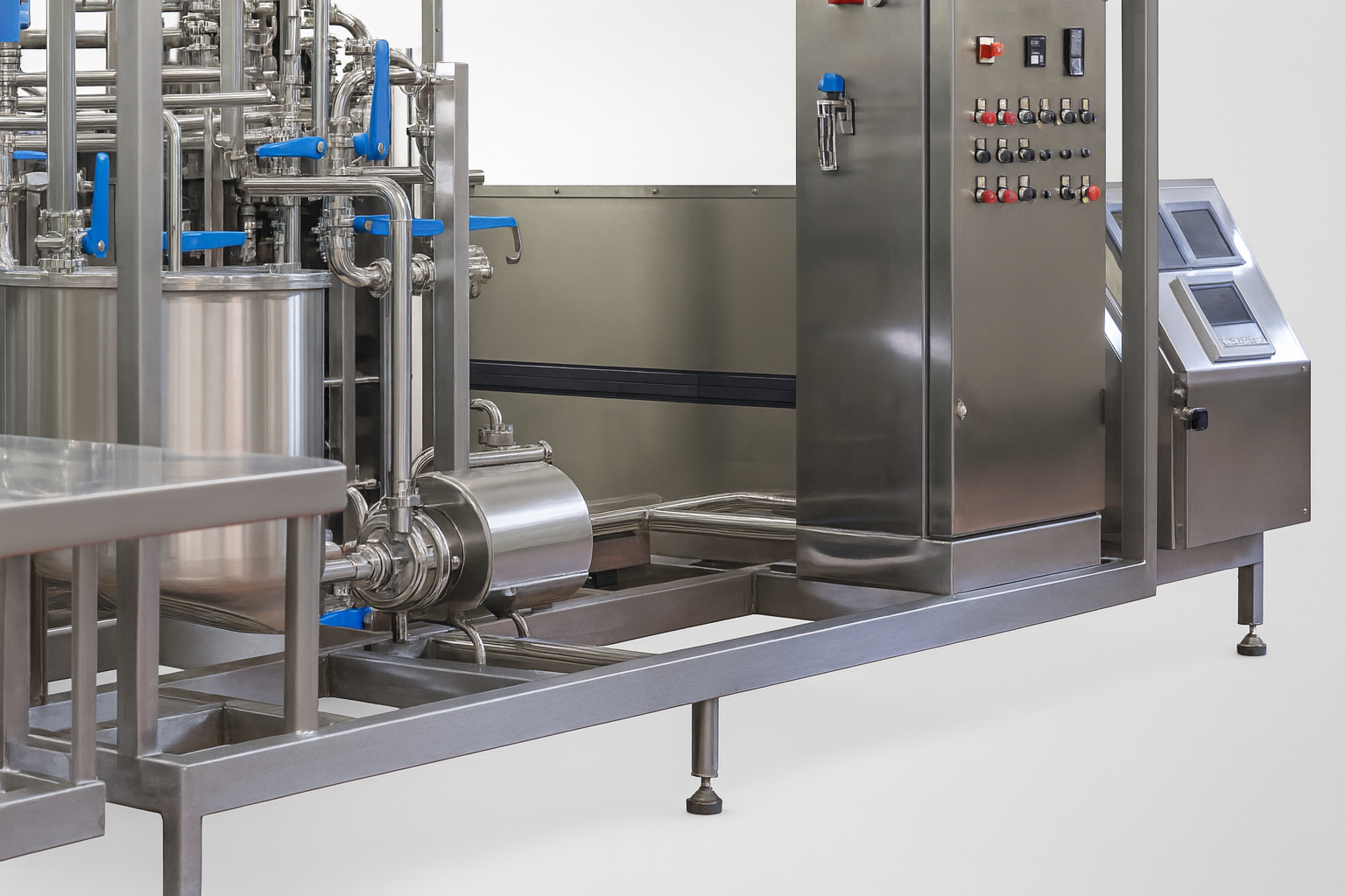 The continuous pasteurization line for ice cream mix (using hot water boiler) operates through homogenization, pre-cooling, and instant cooling down to 4°C.